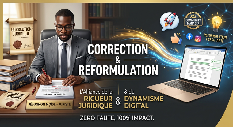 Je m’appelle Jésugnon Moïse Koupei, et je ne suis pas un simple correcteur. Juriste spécialisé en contentieux et Community Manager certifié, je mets mon double profil au service de vos textes. Ma mission ? Transformer vos écrits pour qu’ils soient irréprochables, fluides et impactants.
