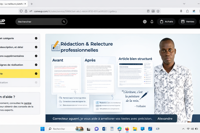 Bonjour et bienvenue sur mon profil ! Je suis spécialisé dans : • La rédaction de contenus clairs et impactant (articles, blogs, fiches produits, scripts, etc.) • La relecture et correction pour un texte impeccable et professionnel • Le montage de vidéos publicitaires dynamiques et engageantes • La traduction française ↔ anglais avec un haut niveau de précision et d’adaptation culturelle. Mon objectif est de vous fournir des prestations de qualité, rapides et adaptées à vos besoins, afin de valoriser vos projets et booster votre communication. 🔹 Services proposés Rédaction professionnelle • Articles de blog, contenus web, fiches produits, scripts vidéo • Style adapté à votre audience (informatif, commercial, créatif) • Livraison rapide et personnalisée Relecture & correction • Orthographe, grammaire, syntaxe • Amélioration du style et de la fluidité • Texte prêt à être publié Montage vidéo publicitaire • Vidéos courtes et percutantes pour réseaux sociaux ou campagnes marketing • Ajout de musique, sous-titres et effets visuels • Format optimisé pour chaque plateforme Traduction français ↔ anglais • Traduction fidèle et naturelle • Adaptation au contexte (marketing, technique, académique) • Double vérification pour garantir la qualité • Rédaction : à partir de 20 € / 500 mots • Relecture : à partir de 15 € / 1000 mots • Montage vidéo : à partir de 50 € / vidéo courte (30-60 sec) • Traduction : à partir de 25 € / 500 mots