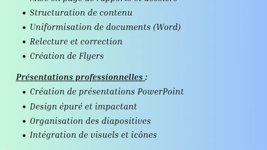 Je vous accompagne dans la rédaction ou l’amélioration de vos documents professionnels afin qu’ils soient clairs, professionnels et faciles à comprendre.