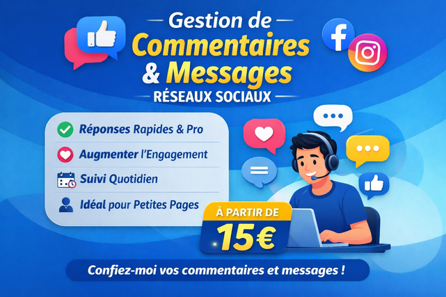 Si vous gérez une page Facebook ou un compte Instagram, vous savez à quel point il peut être difficile de répondre à tous les messages, commentaires et questions de vos abonnés. C’est là que j’interviens ! Je propose un service professionnel de gestion de commentaires et de messages pour vos réseaux sociaux, conçu pour vous aider à rester proche de votre communauté et à donner une image sérieuse et réactive de votre page.