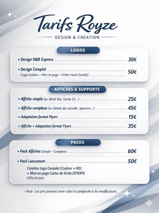 Besoin d'un visuel qui marque les esprits ? Je suis Royze, créateur visuel spécialisé dans le design moderne et percutant. Que vous soyez un organisateur d'événements, un jeune entrepreneur ou un indépendant, je transforme vos idées en supports professionnels. Mon objectif : allier esthétique moderne et clarté pour booster votre communication. Pourquoi travailler avec moi ? Réactivité : Livraison rapide pour vos urgences (Logos Express, Affiches de soirée). Style Moderne : Des designs épurés, stylés et adaptés aux tendances actuelles. À l'écoute : Chaque projet est unique, je m'adapte à vos besoins et à votre budget. Mes services : ✅ Logos : Du concept Express N&B au pack complet haute définition. ✅ Événementiel : Affiches de soirées, DJ, Blind-Tests et programmes détaillés. ✅ Supports Pro : Mise en page de cartes de visite et flyers publicitaires. Prêt à donner vie à votre projet ? Consultez mes offres ou envoyez-moi un message pour discuter de votre idée ! Royze – Le design, tout simplement.