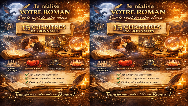 Je vous propose de réaliser votre roman complet, structuré et captivant, sur le sujet de votre choix, avec 15 chapitres bien organisés pour donner vie à votre histoire.