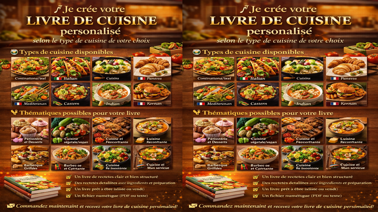 Je vous propose de réaliser votre livre de recettes personnalisé, structuré et facile à suivre, avec des recettes gourmandes selon le style de cuisine que vous choisissez.