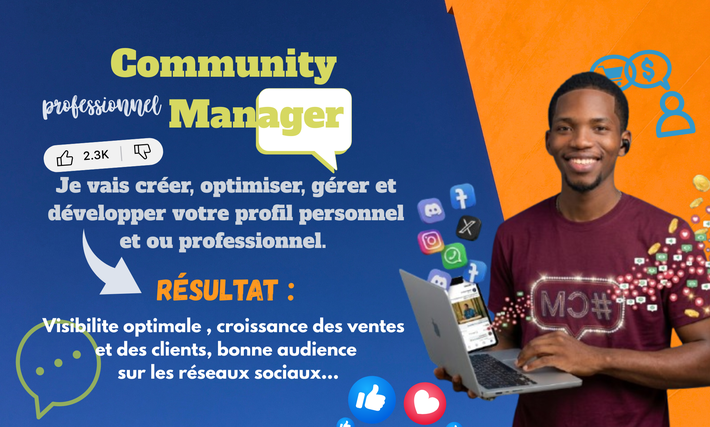 Je suis Community Manager spécialisé dans la gestion et la croissance des réseaux sociaux (pages Facebook, Instagram, Tik Tok...) Ma mission est simple : transformer vos réseaux sociaux en véritable outil d’acquisition de clients. Aujourd’hui, beaucoup d’entreprises publient… mais n’obtiennent ni visibilité, ni engagement, ni ventes. Mon rôle est de corriger cela grâce à une stratégie de contenu claire et efficace. Voici ce que je peux faire pour vous : ✓ Création de publications professionnelles et engageantes✓ Rédaction de textes optimisés pour attirer l’attention ✓ Planification stratégique de contenu ✓ Gestion et animation de communauté ✓ Augmentation de la visibilité et de l’engagement ✓ Conseils pour transformer les abonnés en clients J’utilise des méthodes simples mais puissantes : storytelling, stratégie de contenu et analyse des performances et autres. Que vous soyez entrepreneur, marque, PME/PMI ou commerce, je vous aide à : • développer votre présence en ligne • renforcer votre image de marque • attirer plus de prospects Objectif : faire de vos réseaux sociaux un véritable levier de croissance. Je suis disponible pour vous accompagner dans votre projet.