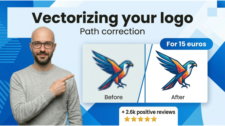 I take your logo, illustration or pixelated image and manually redraw it in vector format with surgical precision. No sloppy automated conversion by software. A real hand-drawn recreation, line by line, curve by curve, for a result that's clean, sharp and professional.
