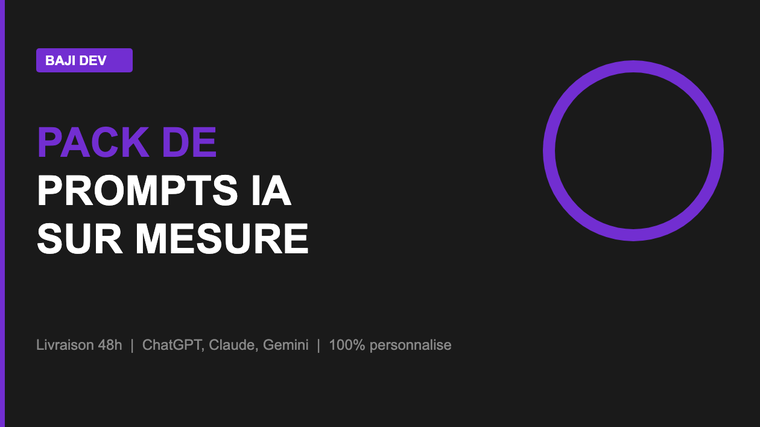 ➜ Je cree un pack de prompts IA 100% personnalises pour TON business. Pas des prompts generiques trouves sur Google. Des prompts testes, structures, qui produisent des resultats PRO a chaque utilisation.