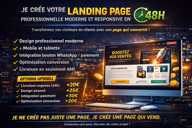 Je crée pour vous une landing page moderne, rapide et optimisée pour convertir vos visiteurs en clients.