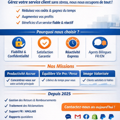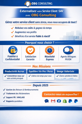 Externalisez votre service client / SAV avec OBG Consulting Chez OBG Consulting, nous prenons en charge la gestion complète de votre service client et de votre SAV selon vos consignes. Vous n’aurez plus qu’à consulter les rapports journaliers que nous vous transmettrons. Notre objectif : vous offrir un service de qualité premium à un tarif compétitif. Ce service est fait pour vous si : • Vous souhaitez réduire vos coûts sans compromettre la qualité du service client. • Vous désirez augmenter vos profits en déléguant des tâches chronophages. • Vous gérez vous-même votre service client, mais cela vous prend trop de temps ou vous ennuie. • Vous voulez gagner du temps pour votre vie personnelle ou pour vous concentrer sur des activités stratégiques. • Vous n’êtes pas satisfait de votre prestataire actuel et recherchez fiabilité, professionnalisme et réactivité. Un service client de qualité renforce l’image de votre marque et fidélise vos clients. Confiez-nous cette mission et concentrez-vous sur la croissance de votre entreprise : stratégie, marketing et innovation. Pourquoi externaliser votre service client chez nous ? • Fiabilité et loyauté : nous respectons strictement vos consignes et vos valeurs. • Priorité à votre satisfaction : si vos attentes ne correspondent pas à nos services, nous préférons décliner la prestation plutôt que de décevoir. • Sécurité des données : chaque collaborateur signe une clause de confidentialité stricte. • Réactivité exemplaire : réponses quasi immédiates sur le tchat et sous 1 h sur les autres canaux (réseaux sociaux, e mails, etc.). Vos bénéfices • Productivité accrue : concentrez-vous sur le cœur de votre activité et devancez vos concurrents. • Meilleur équilibre de vie : libérez du temps pour votre bien-être, vos proches ou vos loisirs. • Expertise à coût raisonnable : bénéficiez du savoir-faire de professionnels qualifiés sans exploser votre budget. • Réduction des litiges et avis négatifs, amélioration de la satisfaction client. • Valorisation de votre image de marque : vos clients deviennent vos ambassadeurs. Nos domaines de maîtrise Nous gérons votre service client sur les principales plateformes : Chatra, Dsers, Facebook, Gmail, Instagram, Paypal, Shopify, etc. Si vous utilisez un autre outil, nous nous y adaptons rapidement grâce à notre forte capacité d’apprentissage. Déroulement de la prestation Vous nous exposez vos attentes et vos procédures (retours, remboursements, etc.). Nous configurons votre service client dans l’heure suivant votre commande (pendant nos horaires). L’agent(e) dédié(e) à votre compte prend ses fonctions et vous consulte pour les premiers ajustements. Nous gérons l’ensemble des canaux (mails, tchat, réseaux sociaux). Vous recevez chaque jour un compte rendu complet sur les demandes et litiges traités. Nos missions principales • Répondre avec soin et empathie aux clients avant, pendant et après l’achat. • Gérer les cas de retours, remboursements et réclamations selon vos consignes. • Remonter les plaintes récurrentes et proposer des axes d’amélioration produits. • Communiquer avec vos fournisseurs et gérer les litiges (PayPal, Stripe, etc.). • Offrir un service bilingue (français / anglais) avec option de traduction automatique pour d’autres langues. Nos tarifs Chez OBG Consulting, nous proposons des offres transparentes et accessibles : Offre Interactions / jour 15 jours 30 jours Standard (peu d’interactions) 1–29 87,99 € 175 € Pro (activité moyenne) 30–59 173,99 € 349,99 € Business (volume élevé) 60–100 339,99 € 699,99 € Business+ (très grand volume) 101–1000 0,22 €/interaction — 💬 Une interaction correspond à toute réponse client, ouverture ou gestion de litige, quel que soit le canal. 🕐 Horaires : Lundi–Vendredi : 8 h–13 h / 14 h–17 h UTC – Samedi : 9 h–13 h. À propos de nous Fondée en octobre 2025, OBG Consulting est une équipe passionnée composée de deux Personnes très dynamiques et orientées Résultats. Notre mission : vous faire gagner du temps en vous garantissant un service client irréprochable. Nous croyons qu’un excellent service doit être accessible à tous les e commerçants, quelle que soit la taille de leur activité. Rejoignez nous, dès aujourd’hui et profitez d’une méthode de gestion moderne, humaine et 100 % orientée satisfaction client. Pour toute question, cliquez simplement sur “Contacter” en haut de la page — nous serons ravis d’échanger avec vous.