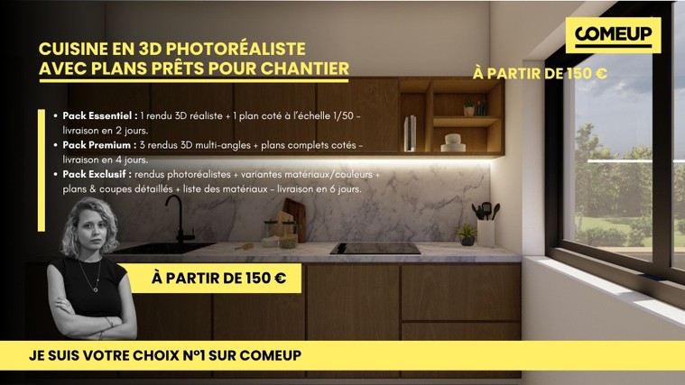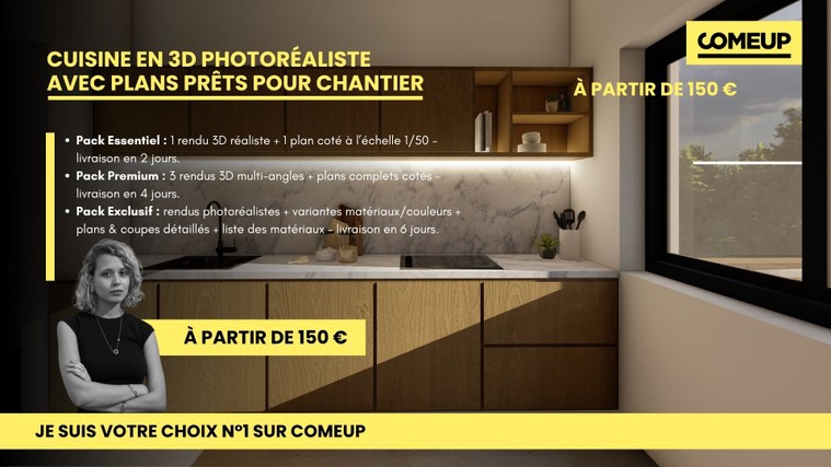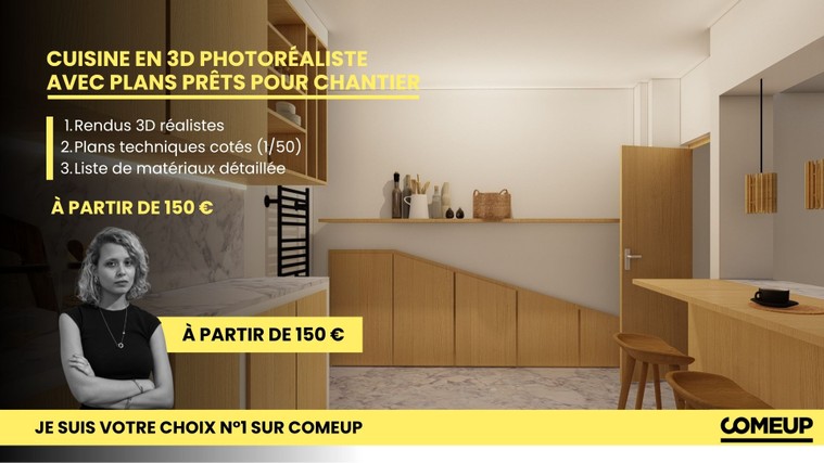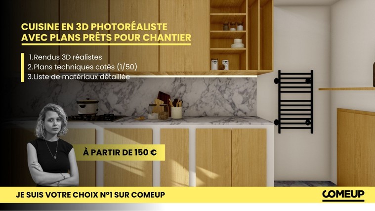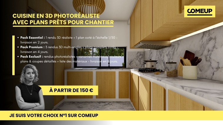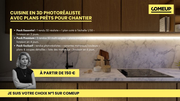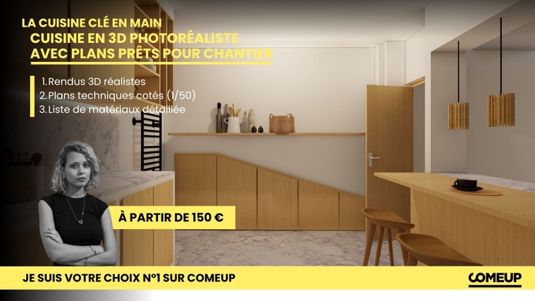 Je vais concevoir votre cuisine en 3D avec rendus réalistes et plans techniques prêts pour chantier