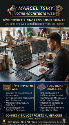 Bonjour. Je suis Marcel Tsiky, développeur web spécialisé dans la conception d'expériences numériques fluides, esthétiques et performantes. Que vous ayez besoin d'une page de capture (landing page), d'un site vitrine ou d'une mise à jour technique, je transforme vos idées en un outil digital qui travaille pour vous.