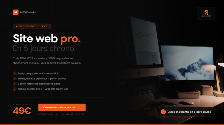 Bienvenue chez MAVE Works 👋 Je crée des sites web professionnels sur mesure pour les entreprises, commerces et indépendants qui veulent une présence en ligne qui leur ressemble vraiment. Contrairement aux constructeurs de sites en glisser-déposer, je code chaque projet en HTML/CSS/JavaScript pur — ce qui garantit un site rapide, léger, 100% personnalisable et sans abonnement mensuel caché. 💼 Ce que je fais concrètement : — Sites vitrines multi-pages pour professionnels — Landing pages optimisées pour convertir — Redesign de sites existants 🎯 Mon engagement : un rendu professionnel, soigné, livré dans les délais — ou je recommence jusqu'à ce que vous soyez 100% satisfait. Vous avez un projet en tête ? Envoyez-moi un message, je réponds sous 24h. ⚡