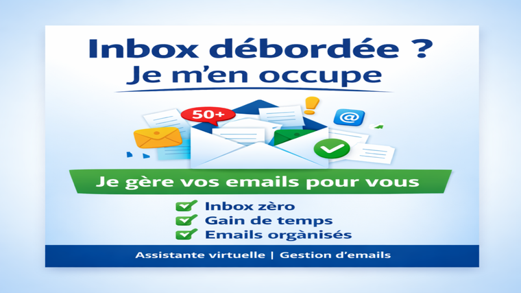 Votre boîte mail vous fait perdre du temps… et de l’énergie ? Entre les messages importants noyés dans la masse, les réponses en attente et les sollicitations inutiles, une mauvaise gestion des emails peut vite devenir un frein à votre productivité. 👉 C’est exactement là que j’interviens. Je vous propose un service de gestion d’emails structuré, confidentiel et efficace, pour transformer votre boîte de réception en un outil clair, fluide et maîtrisé. 💼 Ce que je prends en charge : ✔ Tri intelligent et priorisation de vos emails ✔ Nettoyage complet (spams, newsletters, messages inutiles) ✔ Organisation professionnelle (libellés, dossiers, filtres) ✔ Rédaction et gestion des réponses simples selon vos directives ✔ Mise en place d’un système durable pour maintenir une Inbox zéro ✔ Suivi des messages importants et relances si nécessaire 🎯 Ce que vous gagnez concrètement : ✔ Plusieurs heures libérées chaque semaine ✔ Une meilleure réactivité professionnelle ✔ Une vision claire de vos priorités ✔ Moins de charge mentale, plus de contrôle 🔐 Mon engagement : Je travaille avec rigueur, discrétion et professionnalisme. Vos données et vos échanges restent strictement confidentiels. 🚀 Pour qui est ce service ? ✔ Entrepreneurs débordés ✔ Freelances et indépendants ✔ Professionnels recevant beaucoup d’emails au quotidien 📩 Passez à l’action Arrêtez de subir votre boîte mail. Confiez-la à quelqu’un qui sait la structurer efficacement. 👉 Contactez-moi maintenant et reprenez le contrôle.