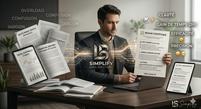 Bienvenue chez LB Simplify. À l'ère de l'infobésité, l'information est partout, mais votre temps est votre ressource la plus précieuse. Mon métier est de lire, d'analyser et de synthétiser à votre place. Je transforme vos documents les plus denses et complexes en mémos clairs, limpides et directement actionnables.