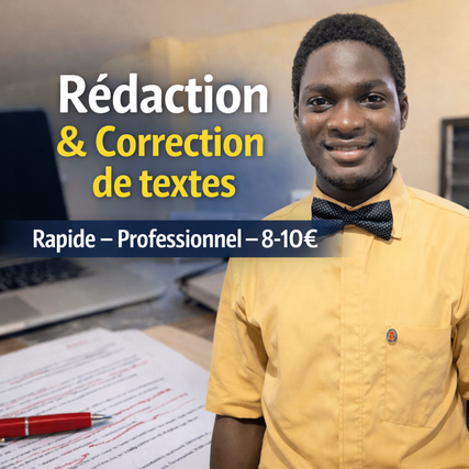 Je vous propose de rédiger ou de reformuler vos contenus avec efficacité. 🔹 Mes services : ✔ Rédaction de textes (devoirs, articles, contenus web) ✔ Reformulation de textes ✔ Correction et amélioration 🔹 Pourquoi me choisir ? ✔ Travail rapide ✔ Texte clair et structuré ✔ Respect de votre demande 📌 Offre de base : 500 mots pour 5€ Je reste disponible pour répondre à vos questions avant toute commande.