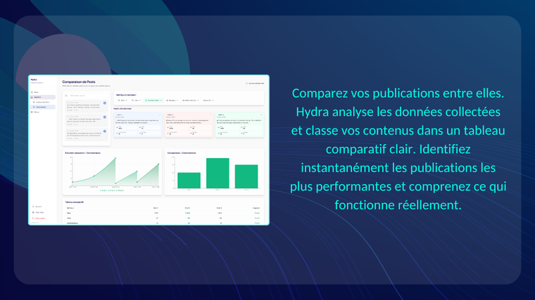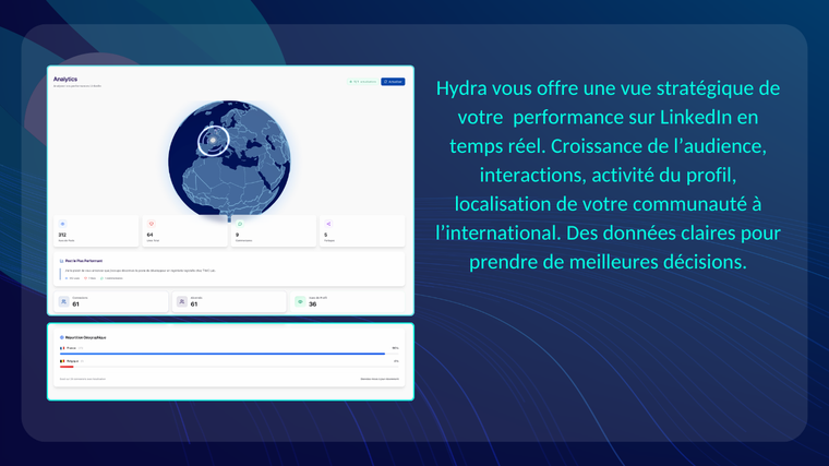 Hydra est un outil analytics LinkedIn ultra-complet qui vous donne une vision stratégique et en temps réel de toute votre présence sur la plateforme.