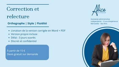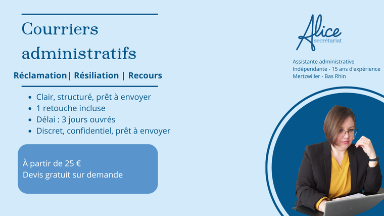 Bonjour ! Je suis Alice, assistante administrative indépendante basée en Alsace, et forte de 15 ans d'expérience auprès des entrepreneurs. **Mon cœur de métier : libérer les professionnels (notamment les artisans du BTP) de la charge administrative. ** Que ce soit pour alléger votre secrétariat quotidien ou pour des missions ponctuelles de classement, de gestion des devis/factures, ou de relation client, je suis là pour vous faire gagner du temps et de l'argent. **Ma promesse : Vous concentrer sur votre cœur de métier. ** Pourquoi me choisir ? Je suis rigoureuse, adaptable et je maîtrise les spécificités du secteur de la construction. N'hésitez pas à me contacter pour discuter de vos besoins spécifiques !