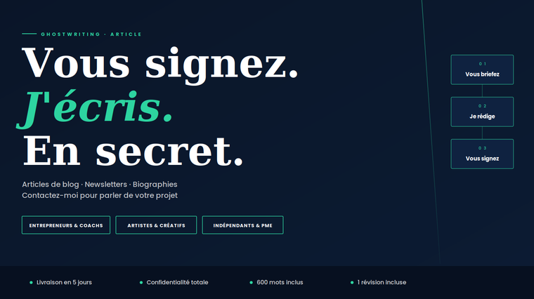 Je prends votre place. Vous signez, vous publiez. Personne ne sait que vous n'avez pas écrit — et c'est exactement le but.