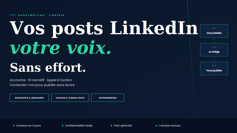 Je vais rédiger vos posts LinkedIn en ghostwriting votre voix, votre style, votre signature