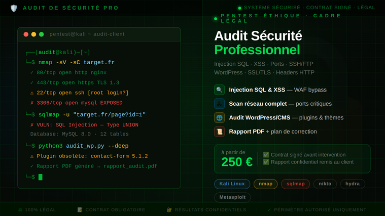 - **Expertise** : Outils professionnels (Kali Linux, sqlmap, nmap, etc.)