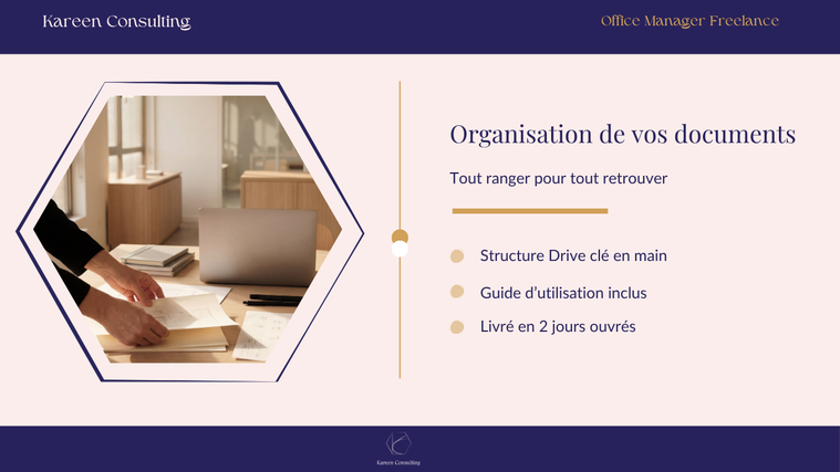 En tant qu'Office Manager avec plusieurs années d'expérience, je construis une structure Google Drive claire, logique et durable — adaptée à votre situation personnelle.