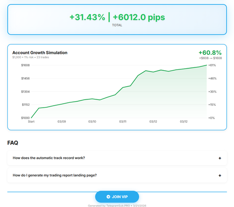 Je vais configurer pour vous le bot TelegramSub : un système intelligent qui scanne votre canal de signaux en automatique, calcule vos performances (Pips, Win Rate) et génère une page de vente (Landing Page) professionnelle pour convertir vos membres en clients payants.
