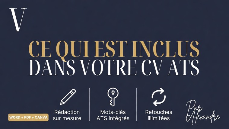 Cette offre comprend l'analyse complète de votre CV actuel par rapport au poste visé, la création ou l'amélioration de votre CV en français (format ATS ou moderne), l'intégration stratégique des mots-clés de votre secteur, l'optimisation pour les logiciels de tri ATS (Taleo, Workday, SAP, Lever), la valorisation de vos réalisations chiffrées et la livraison en Word (.docx) modifiable + PDF prêt pour impression. Le lien Canva modifiable est disponible gratuitement sur demande. Un appel de briefing gratuit est proposé. Les retouches sont illimitées jusqu'à votre satisfaction totale. Délai de livraison : 2 jours (express 24h disponible en option).