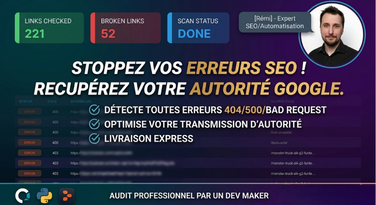 Les erreurs 404 (liens morts) sont de véritables poisons pour votre référencement. Elles brisent le parcours de vos utilisateurs et envoient un signal de "site non entretenu" à Google, ce qui fait chuter votre autorité.