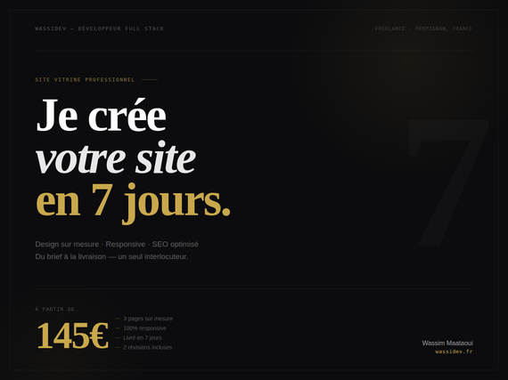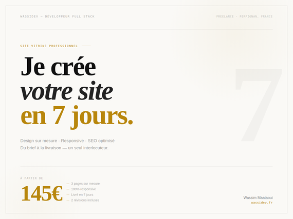 Développeur Full Stack freelance spécialisé en sites vitrines, web apps et e-commerce sur mesure. 5 ans d'expérience en production réelle j'ai lancé et géré une plateforme gérant des millions de visiteurs avec paiements en ligne. Interlocuteur unique du brief à la livraison, je livre dans les délais sans surprise. Disponible pour vos projets web.