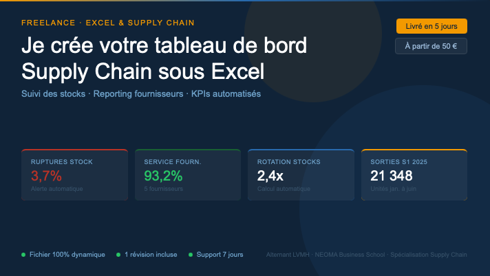 Étudiant en Master Supply Chain (NEOMA Business School), actuellement en alternance chez LVMH, je propose des missions courtes et ciblées pour aider les PME à mieux piloter leur activité. 🎯 Ce que je fais concrètement : Création de tableaux de bord Excel / Power BI clairs et actionnables Suivi des stocks, taux de rupture, rotation des références Reporting fournisseurs automatisé (fini la mise à jour manuelle) Mise en forme et structuration de fichiers de données existants ✅ Pour qui ? Les TPE et PME qui ont des données mais pas le temps ou les ressources pour les exploiter correctement. 📦 Ce que vous recevez : Un fichier propre, documenté, prêt à l'emploi — livré en 5 à 7 jours. N'hésitez pas à me contacter avant de commander pour qu'on cadre ensemble votre besoin.