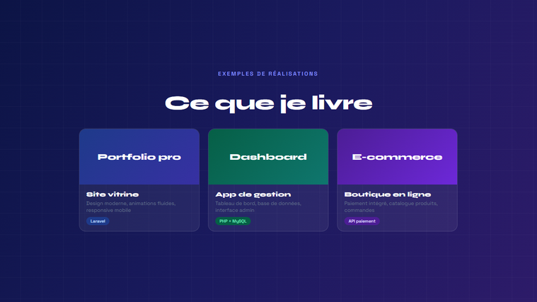 Chaque projet est développé avec une attention particulière sur : la performance, la sécurité, l’expérience utilisateur.
