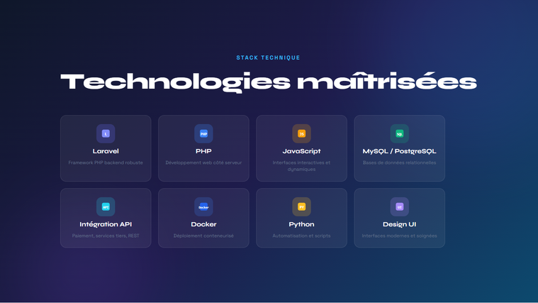 Développeur Full-Stack spécialisé en Laravel, je conçois des applications web robustes, sécurisées et performantes adaptées aux besoins des entreprises. Je maîtrise PHP (Laravel), JavaScript, TypeScript et Python, ainsi que Docker pour le déploiement et la gestion d’environnements professionnels. J’interviens sur tout le cycle de développement : création d’applications, APIs, systèmes de gestion, maintenance et optimisation. En complément, je possède des compétences en création graphique et traitement d’images, ce qui me permet de livrer des solutions complètes et prêtes à l’utilisation. Mon objectif, vous fournir une solution fiable, moderne et évolutive, avec un code propre et maintenable.