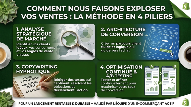 La vérité : 90% des boutiques Shopify échouent à cause d'un mauvais design, de textes qui ne convainquent pas et d'un parcours d'achat qui perd le visiteur en route.