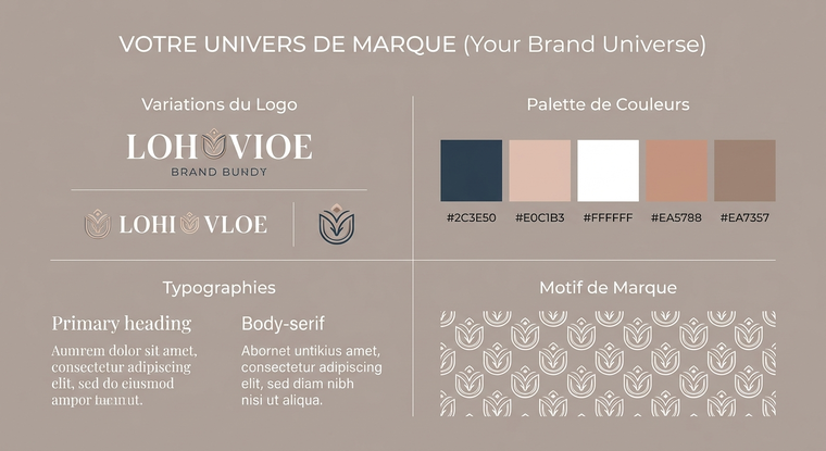 Pack Identité Complète : Guide de style avec codes couleurs (HEX/RGB) et typographies.