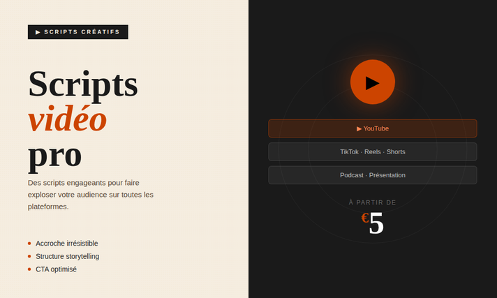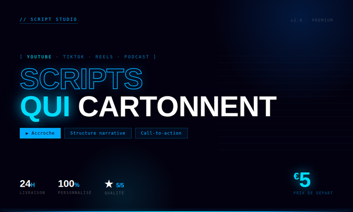 Je rédige pour vous des scripts clairs, dynamiques et impactants qui retiennent votre audience dès les premières secondes