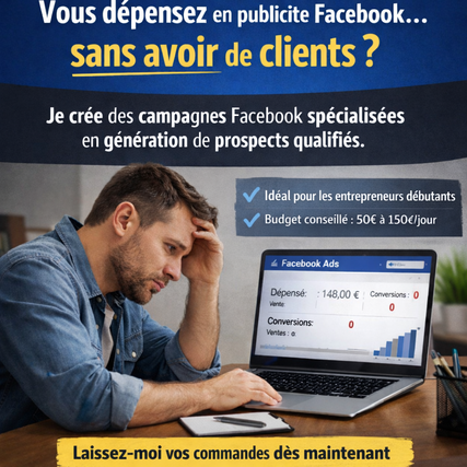 Je crée pour vous des campagnes Facebook spécialisées en génération de prospects qualifiés, conçues pour transformer vos dépenses publicitaires en véritables clients.