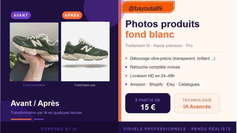 Grâce à un traitement IA de haute précision, je transforme vos photos en images fond blanc nettes, propres et prêtes à vendre — conformes aux standards des plus grandes plateformes e-commerce.