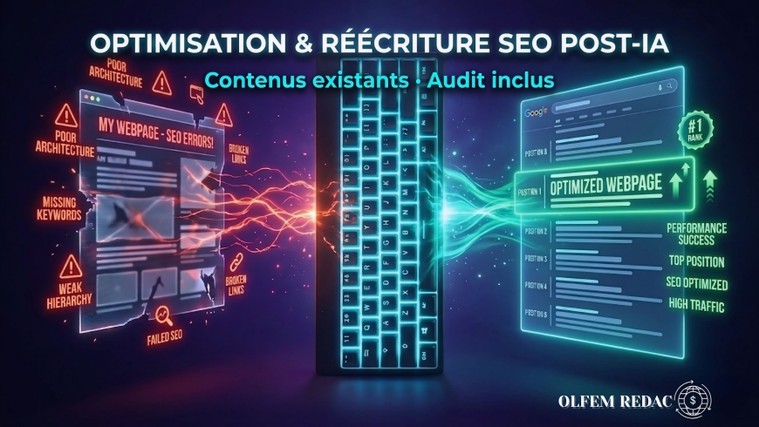 Freelance depuis 2019, formé et rompu aux standards du SEO Post-IA. J'aide PME, entrepreneurs et agences à créer du contenu authentique, efficace et performant sur Google – pas du volume, mais de la profondeur humaine conçue pour convertir. 🎯 MON APPROCHE Diagnostic contextuel · Analyse SERP · Rédaction optimisée EEAT++ – Chaque contenu s'intègre à votre stratégie long terme, même sans plan éditorial existant. ✅ MES GARANTIES • Brief de cadrage offert dès la commande • Livraison dans les délais convenus • 1 révision incluse sous 7 jours • Confidentialité totale (NDA disponible) • Contenu 100 % contrôlé, sourcé et vérifié Visibilité et conversion. Avec moi, les deux sont à portée. Et tout commence dès la première page. Prêt à reprendre votre place sur Google ? Découvrez mes offres ci-dessous ou consultez mon portfolio complet : https://tinyurl.com/Olfem29SEO