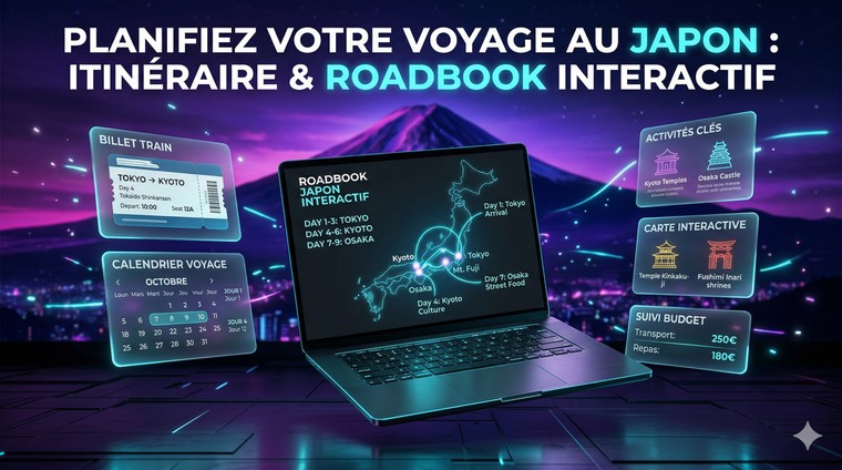 Ce que vous recevrez : Un module Budget Automatisé : Suivi de vos dépenses (Vols, Hôtels, Transports) et calcul de votre "Surplus Garanti" pour parer aux imprévus. Vos Alertes de Réservation (Cron Jobs) : Le calendrier exact des jours où vous devez réserver vos billets critiques pour ne rien rater (J-30, J-60...). Un itinéraire "Golden Route" optimisé de 21 jours : Le parcours classique (Tokyo, Kyoto, Osaka, Hiroshima) incluant des "hacks" d'initiés (ex : visiter l'USJ le bon jour, faire le Fushimi Inari à la Golden Hour). Une Checklist Avant Départ interactive pour partir l'esprit tranquille. Un Coach IA Intégré : Un assistant virtuel pré-configuré pour répondre à vos questions sur le Japon directement dans l'application.