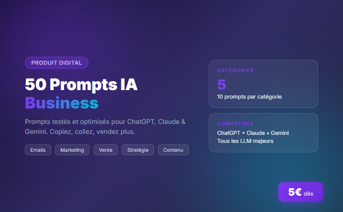 Ce que vous recevez : un PDF professionnel avec les 50 prompts classés, expliqués et prêts à utiliser immédiatement. Livraison en 24h maximum.