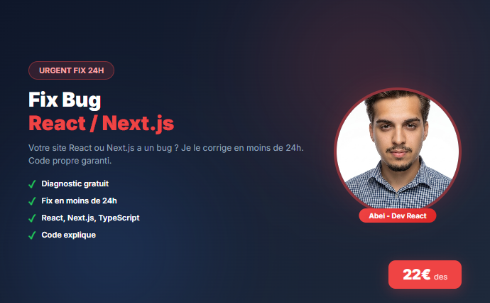 Pourquoi me choisir : je ne suis pas un developpeur WordPress qui a appris React la semaine derniere. Je code en React et Next.js tous les jours depuis des annees. Votre bug sera corrige proprement, pas avec un hack temporaire.