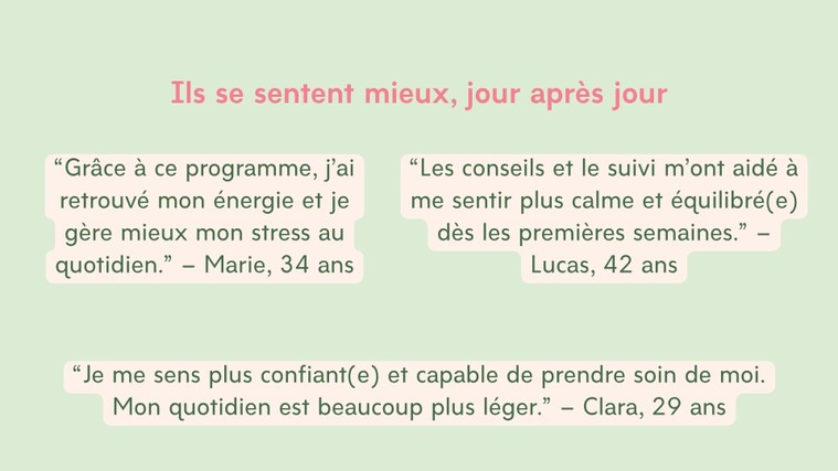 Objectif : retrouver de l’énergie durable, réduire le stress, et mettre en place un quotidien plus équilibré et serein.