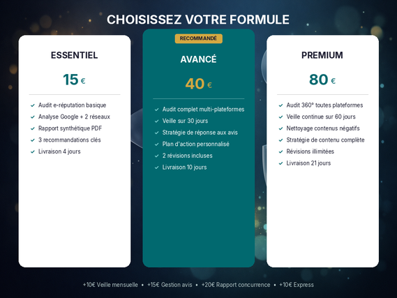 Pack : Prix, Contenu, Analyse avis en ligne, Analyse réseaux sociaux, Templates de réponse aux avis, Stratégie de contenu, Suivi mensuel, Délai