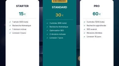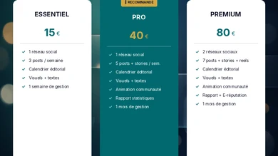 Accompagnement : 93,54 $US, Audit + plan + suivi 1 mois, Oui, Oui, Oui (20 templates), Oui, Oui (4 semaines), 30 jours