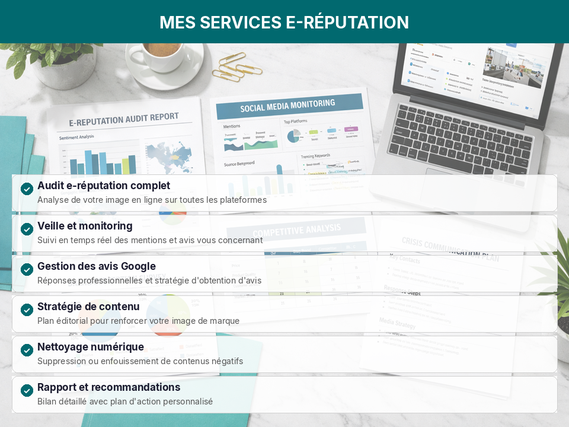 Je suis spécialiste en e-réputation et marketing digital. Je ne me contente pas de surveiller ce qu'on dit de vous en ligne : je construis une stratégie complète pour protéger et améliorer votre image de marque.