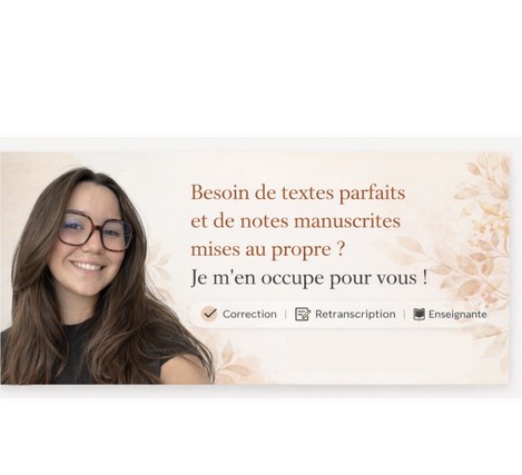 Bonjour 👋 Je suis enseignante et je vous propose un service complet pour améliorer vos textes. 👉 Je peux : • retranscrire vos documents manuscrits • corriger l’orthographe et la grammaire • reformuler pour plus de clarté • mettre en page proprement 📚 Idéal pour : • notes de cours • devoirs d’élèves • rédactions • lettres / CV • documents professionnels 💡 Vous m’envoyez votre document (photo ou texte), je vous rends un document clair, corrigé et prêt à être utilisé. ⏱️ Travail rapide et soigné ✨ Résultat propre et professionnel