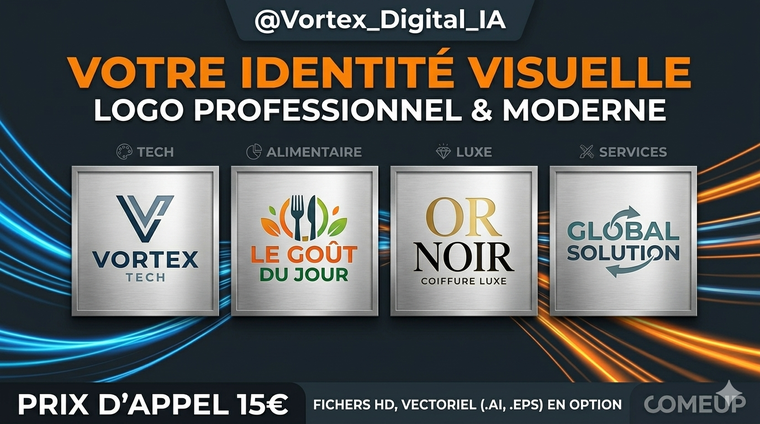 Le logo est l'élément central de votre communication. C'est lui qui permet à vos clients de vous identifier en un clin d'œil et qui véhicule vos valeurs. Chez Vortex Digital IA, nous mettons la puissance de l'Intelligence Artificielle au service de votre image de marque pour vous proposer des créations uniques, percutantes et adaptées aux tendances actuelles du design.