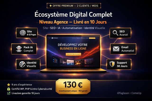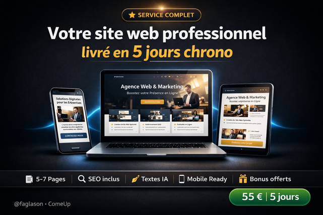 🔴 Le problème que je règle : Vous avez un business sérieux… mais votre présence en ligne ne le reflète pas. Ou pire : vous n'en avez aucune. Résultat ? Des clients potentiels vous cherchent sur Google et trouvent vos concurrents à la place. 😤 Ce que ça vous coûte : Chaque jour sans site professionnel, c'est des devis non demandés, des clients perdus, une crédibilité en dessous de ce que vous méritez. Et les agences web ? Elles vous demandent 500 à 2500 € pour un site qui prend 3 semaines. ✅ Ce que je fais pour vous : Je suis Faglason, développeur WordPress, PHP, HTML/CSS/Javascript, React.js spécialisé dans la création rapide de sites performants, boostés par l'intelligence artificielle. Grâce à mon processus optimisé IA, je livre des sites clés en main en 2 à 5 jours, avec : ✔ Design professionnel adapté à votre secteur ✔ Textes rédigés par IA et optimisés pour convaincre ✔ SEO de base intégré dès la création ✔ Site 100% responsive (parfait sur mobile) ✔ Formulaire de contact + intégration réseaux sociaux ✔ Formation rapide pour gérer votre site seul 🎯 Pour qui ? Entrepreneurs, commerçants, prestataires de services, ONG, startups, professions libérales — toute personne qui veut une présence en ligne qui travaille à sa place. 💬 Ma promesse: Si votre site n'est pas livré dans le délai convenu, je vous offre une retouche gratuite. Je m'engage sur les résultats, pas sur des promesses vides. 📩 Envoyez-moi un message maintenant. Décrivez votre projet en 2 lignes. Je vous réponds sous 2h avec une proposition claire.