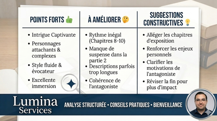 À la fin de ma lecture, je vous remets un compte-rendu détaillé structuré par points forts et points d'amélioration. Ce n'est pas juste un "j'aime / j'aime pas", c'est un véritable outil pour vos futures corrections.