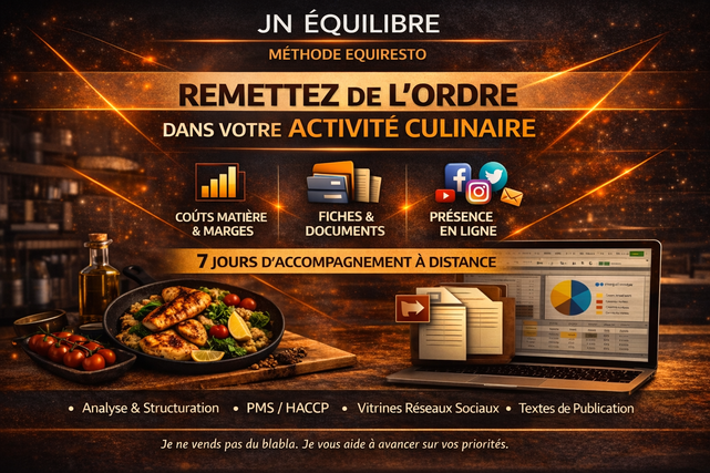 Je vous accompagne à distance pendant 7, 14 ou 30 jours pour remettre de l’ordre dans les éléments utiles à votre activité culinaire.