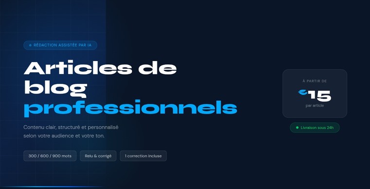 J'utilise l'IA pour travailler efficacement, mais chaque article est relu, corrigé et personnalisé selon votre ton et votre sujet avant livraison. Pas de texte générique copié-collé : chaque article est travaillé pour correspondre à votre secteur et à vos lecteurs.